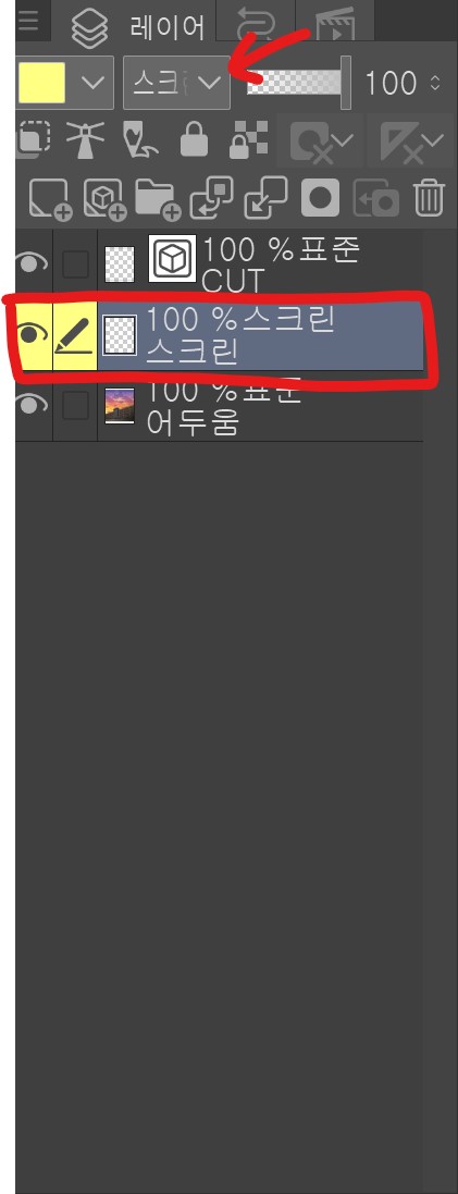 새 레이어를 하나 생성 후 위 화살표 표시부분에서 스크린을 선택해주면 됩니다.