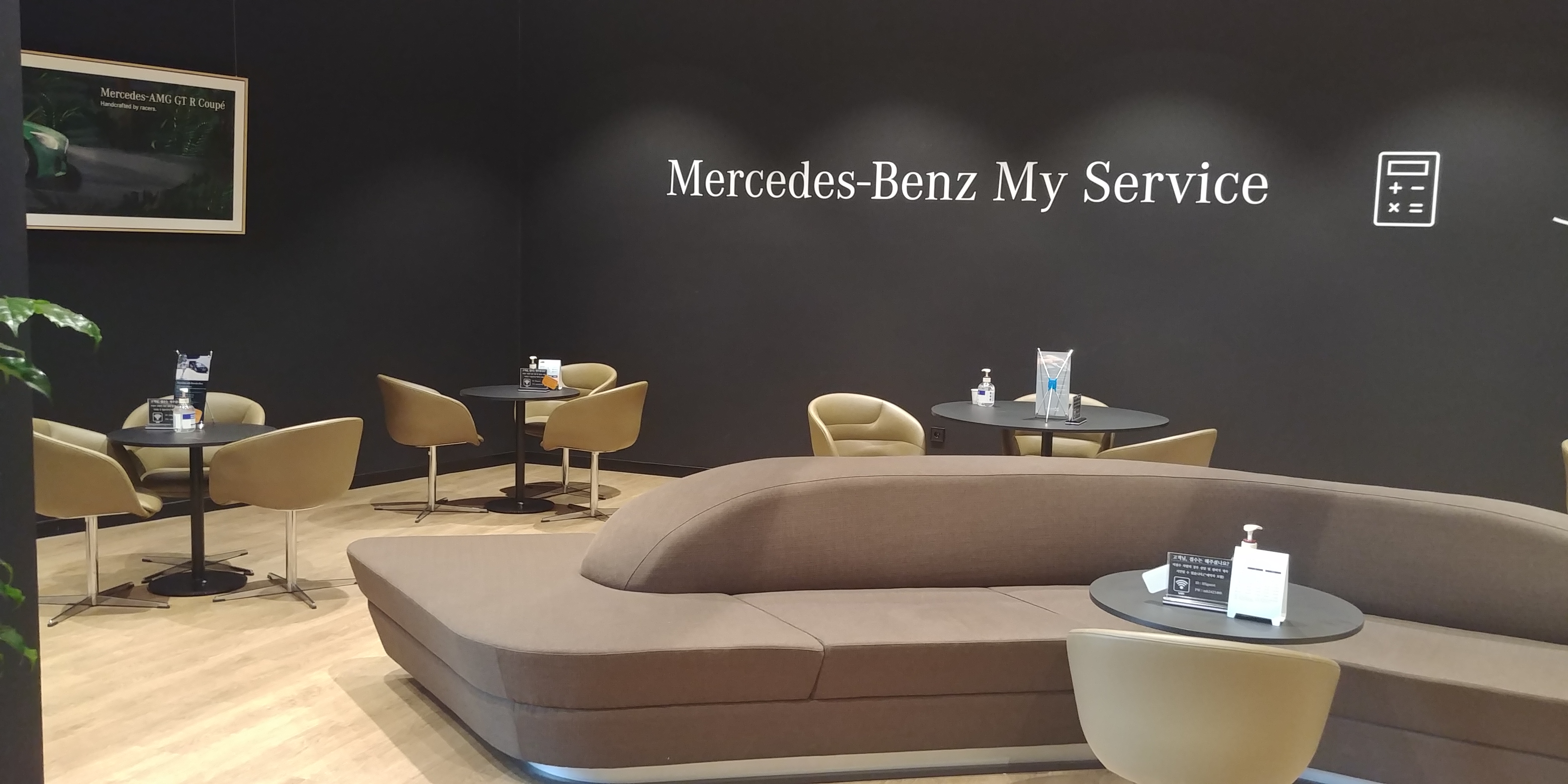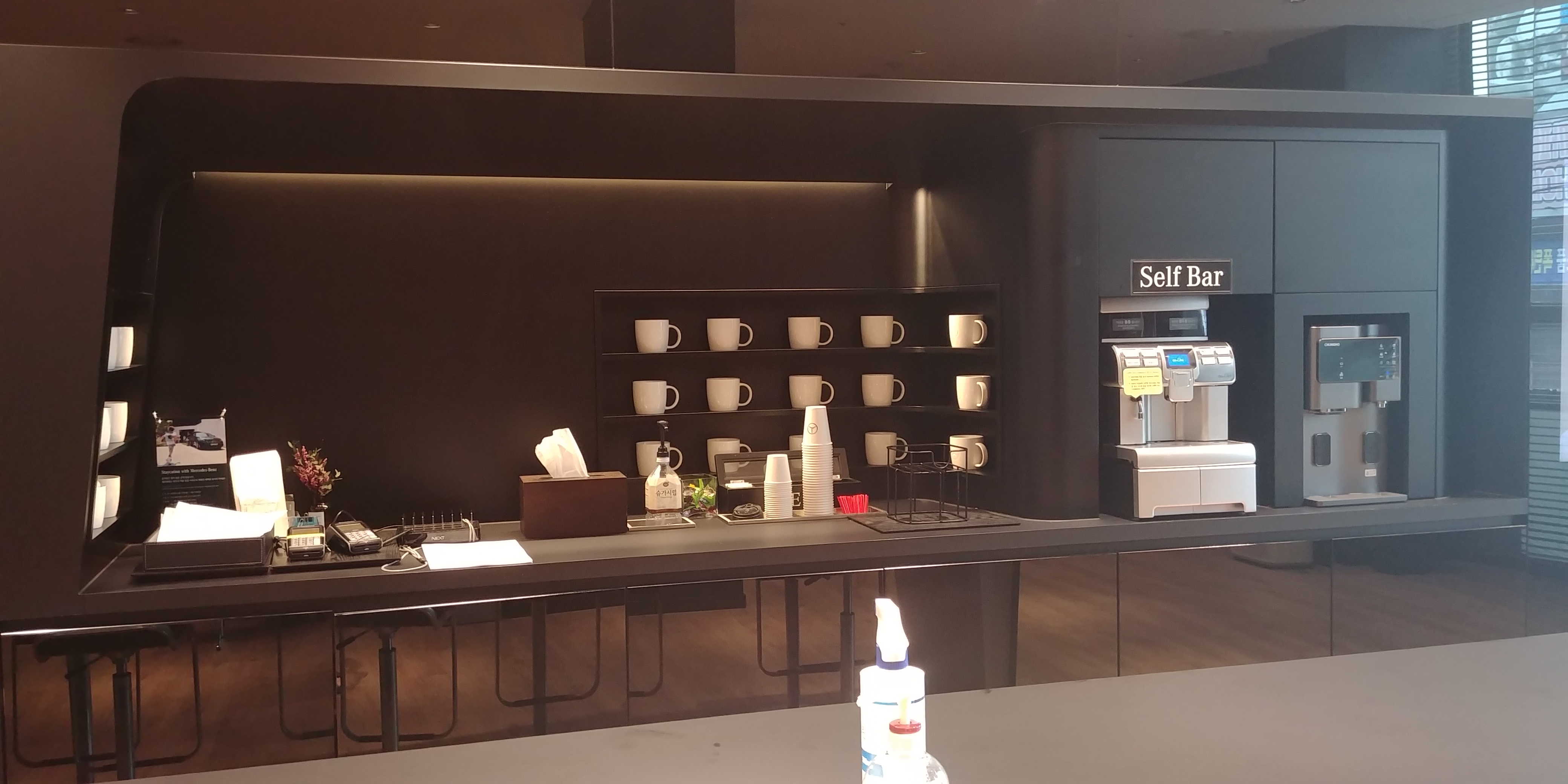 대기하는 동안 차를 마실 수 있도록 셀프바가 준비되어 있다