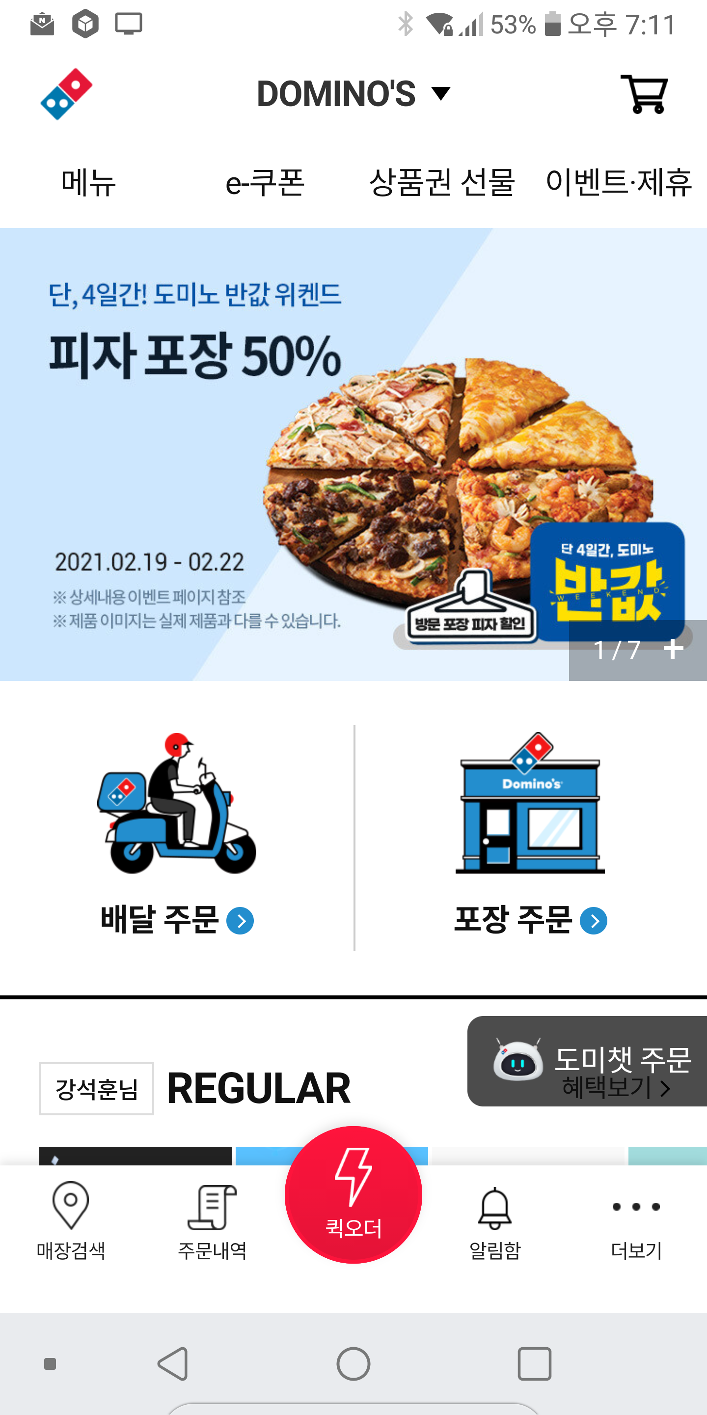 도미노피자에서 19일부터 22일까지 방문포장 시 50% 세일을 한다고 한다!