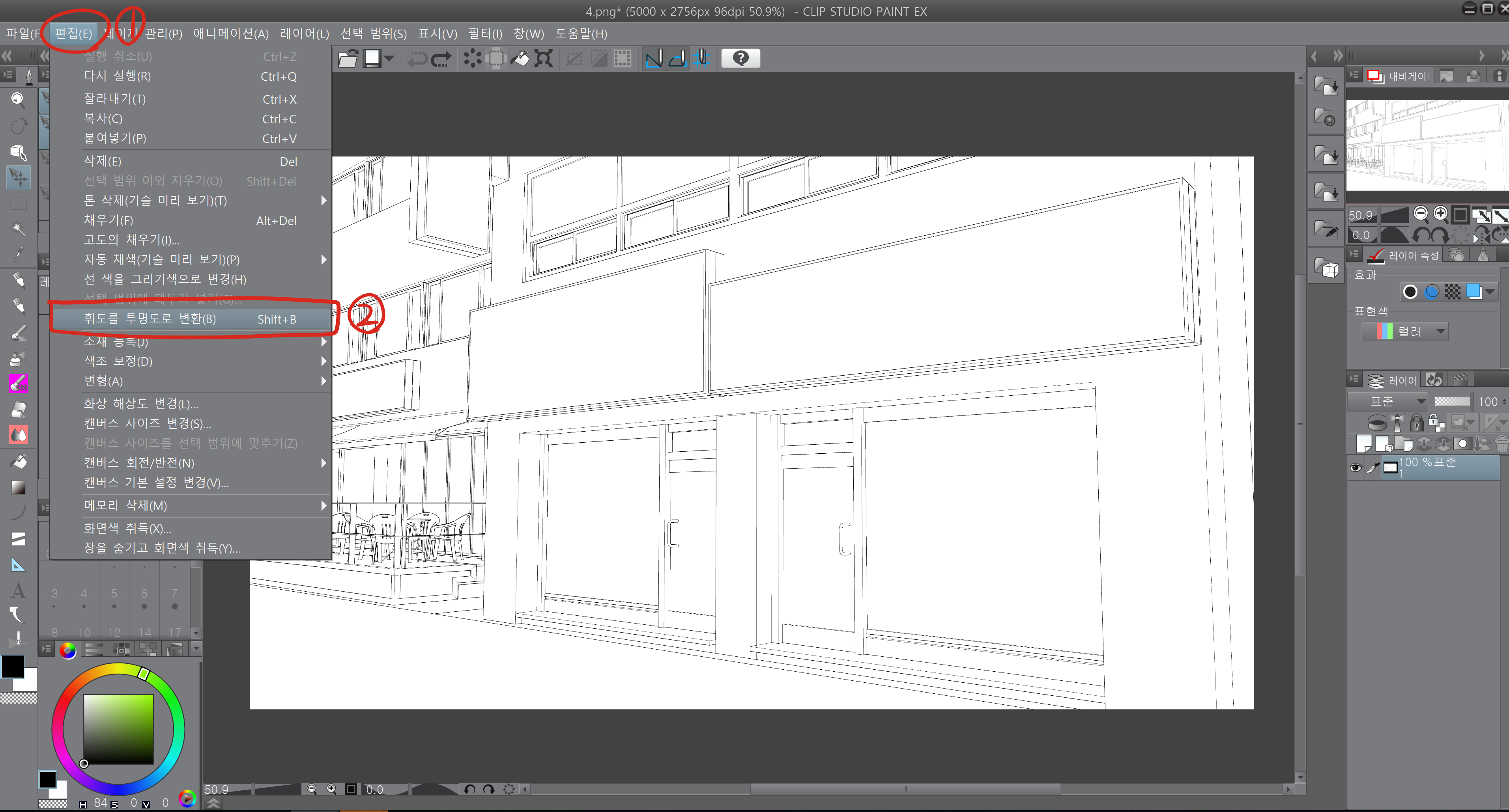 편집->휘도를 투명도로 변환을 클릭합니다. (주의, 단축키는 제가 설정한 것이므로 다른 프로그램상에서는 다릅니다.)