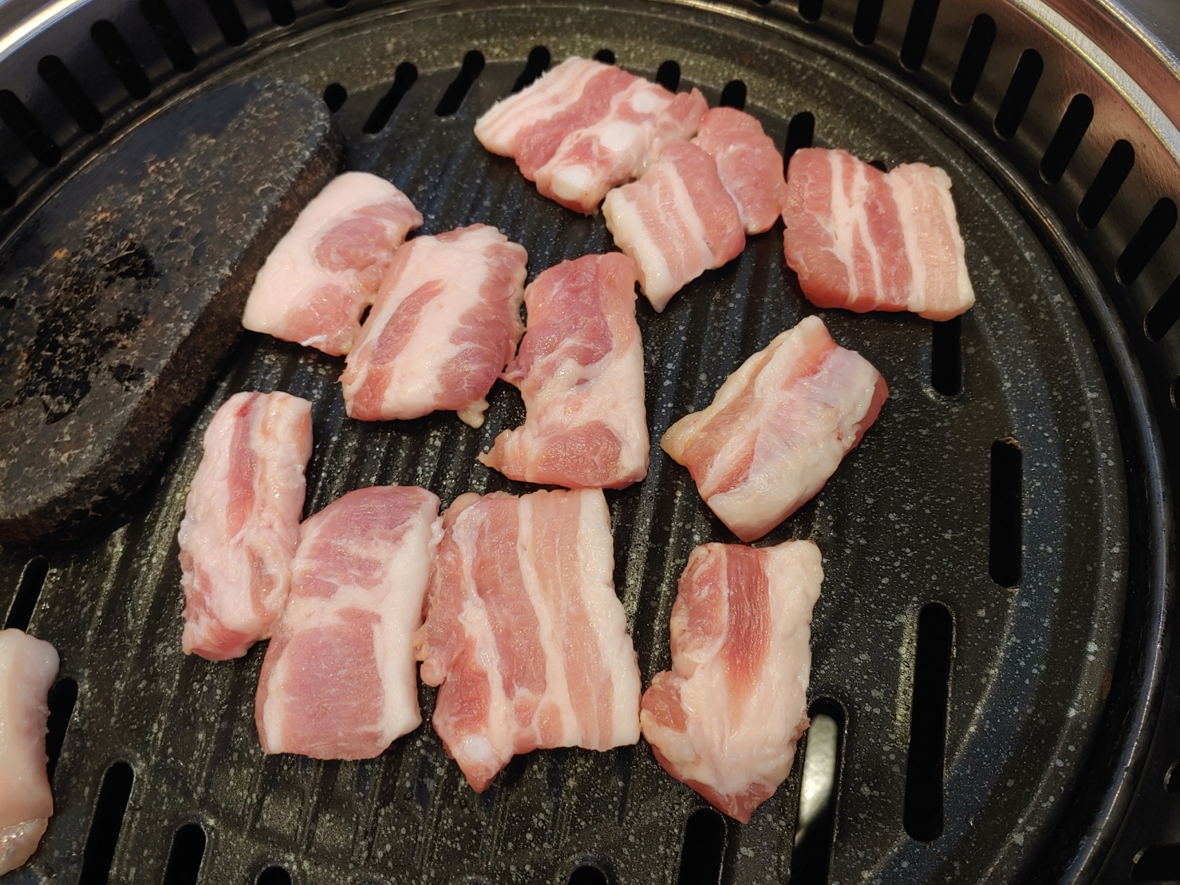 불판 위의 저 비계로 불판을 기름지게 달궈야 한다