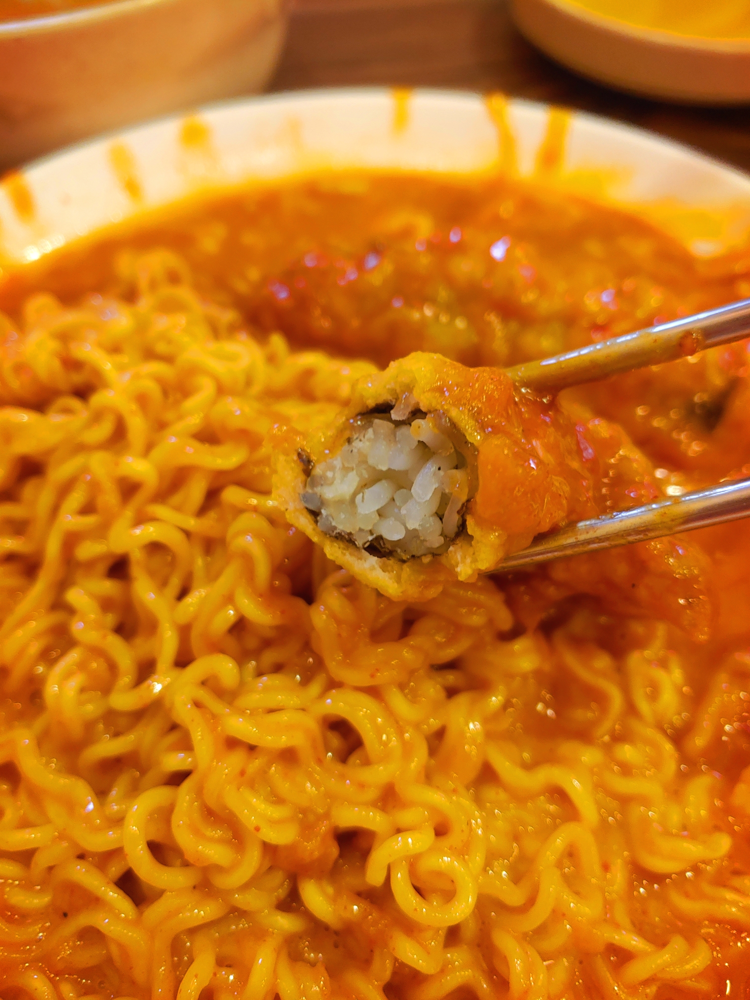 한 입 베어문 다음에는 저 속 틈새로 라볶이 소스들을 마구 넣어줘야 한다