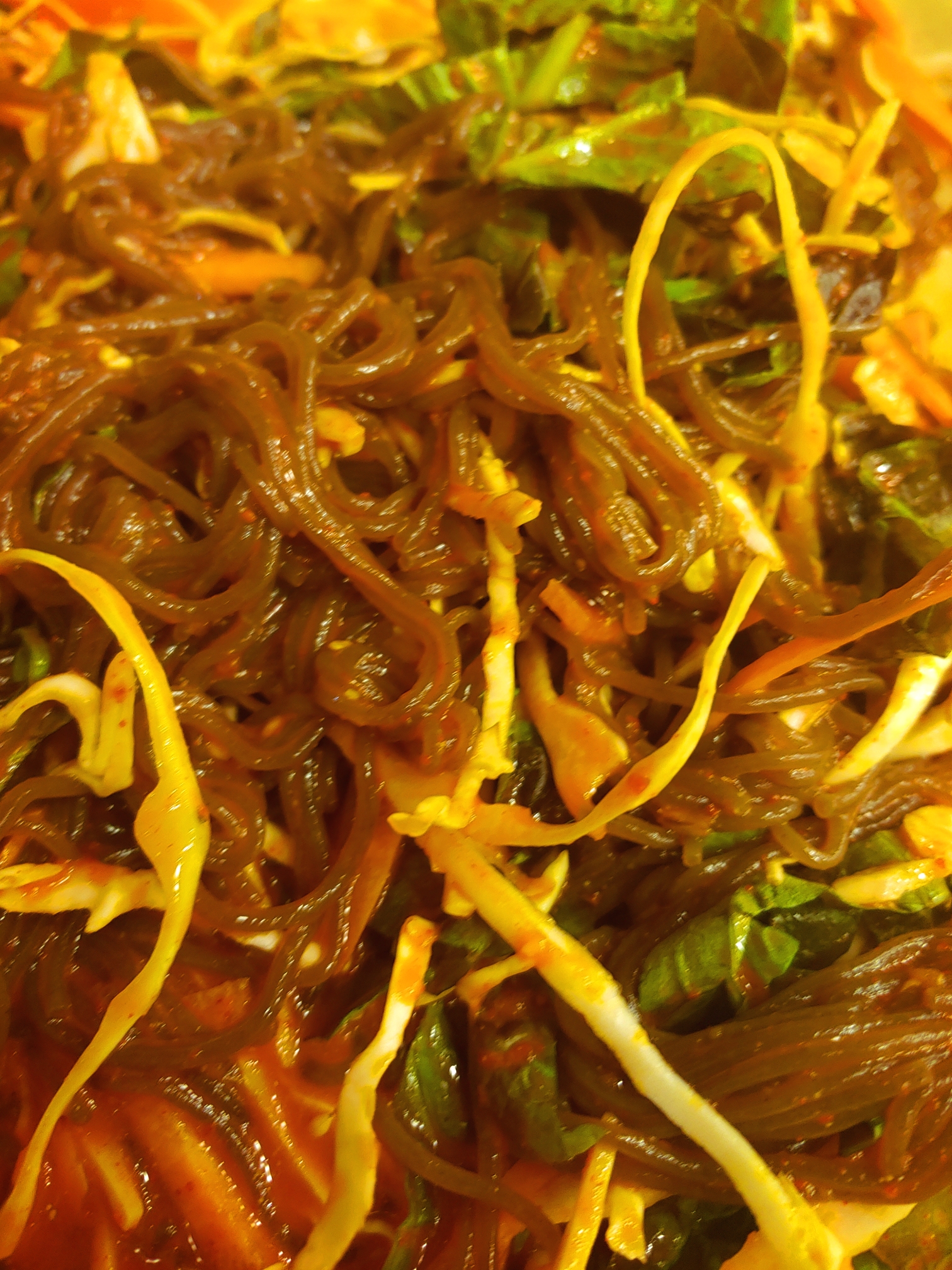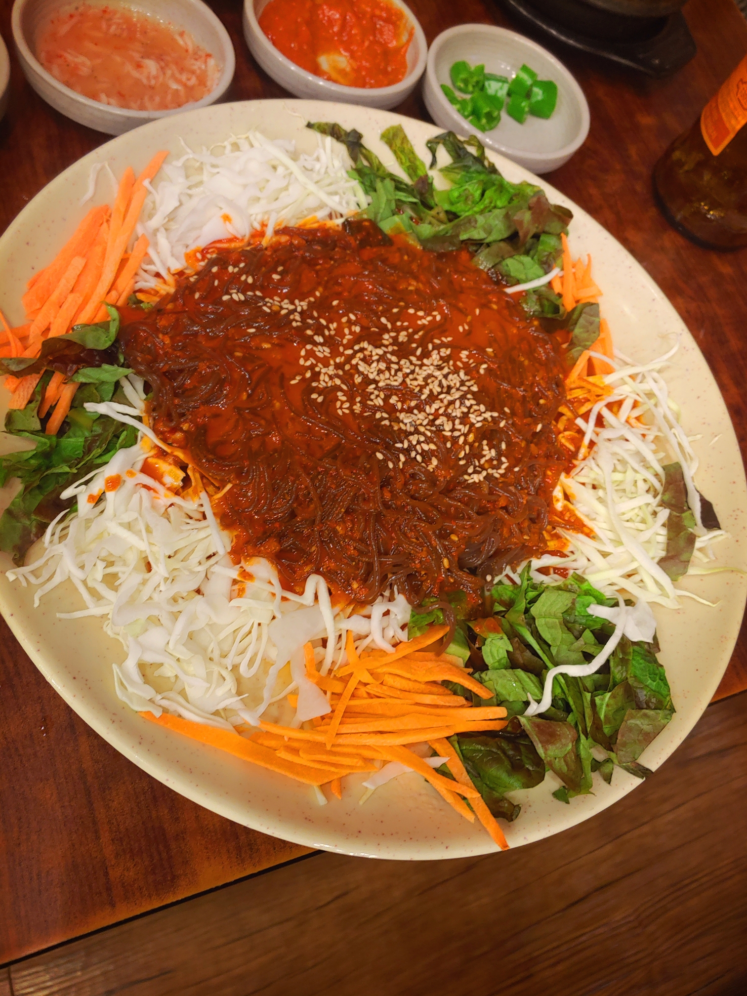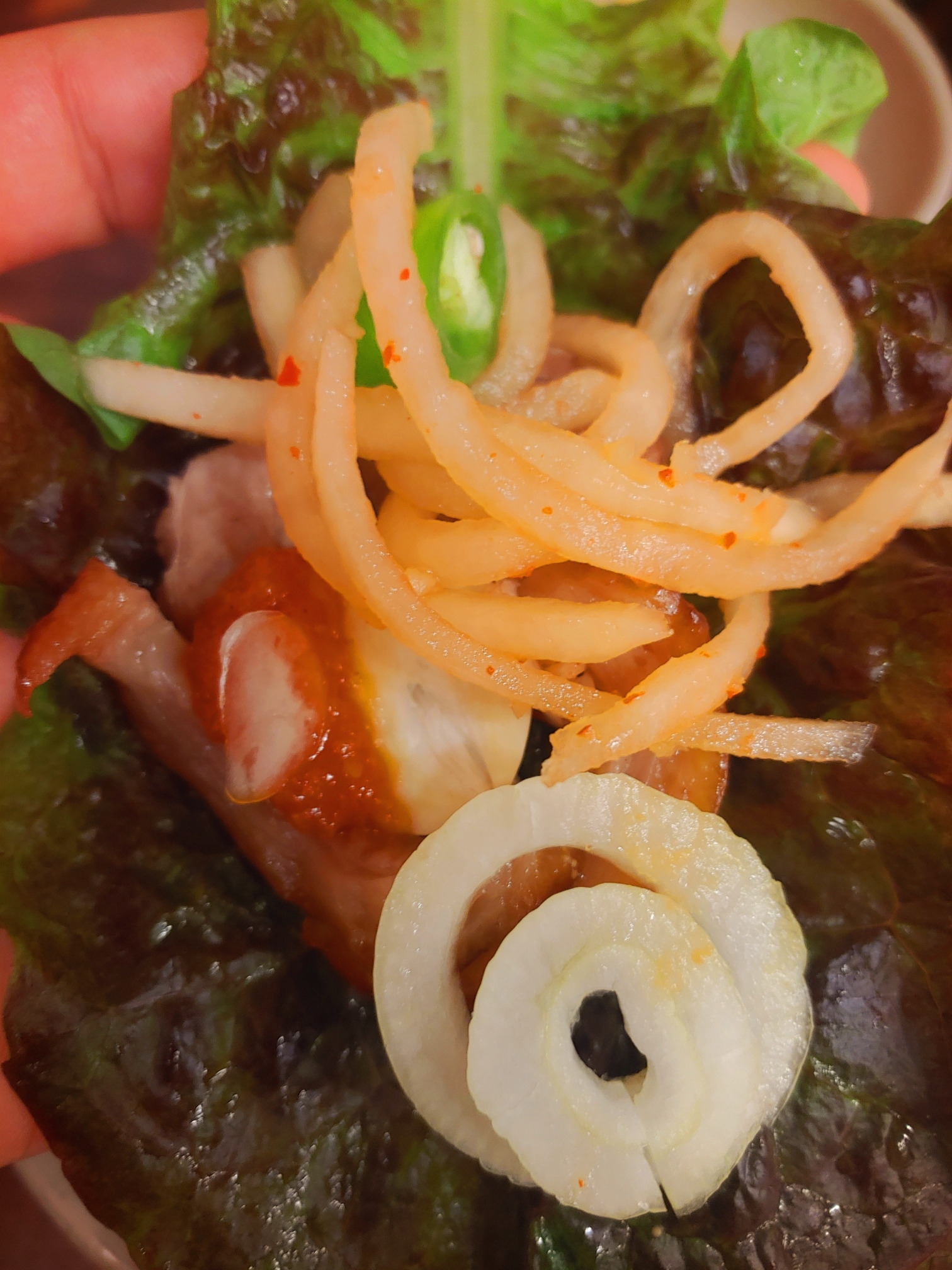 쟁반국수도 함께 싸서 먹으면 탄수화물의 조합으로 맛이 더욱 강력크 해진다!