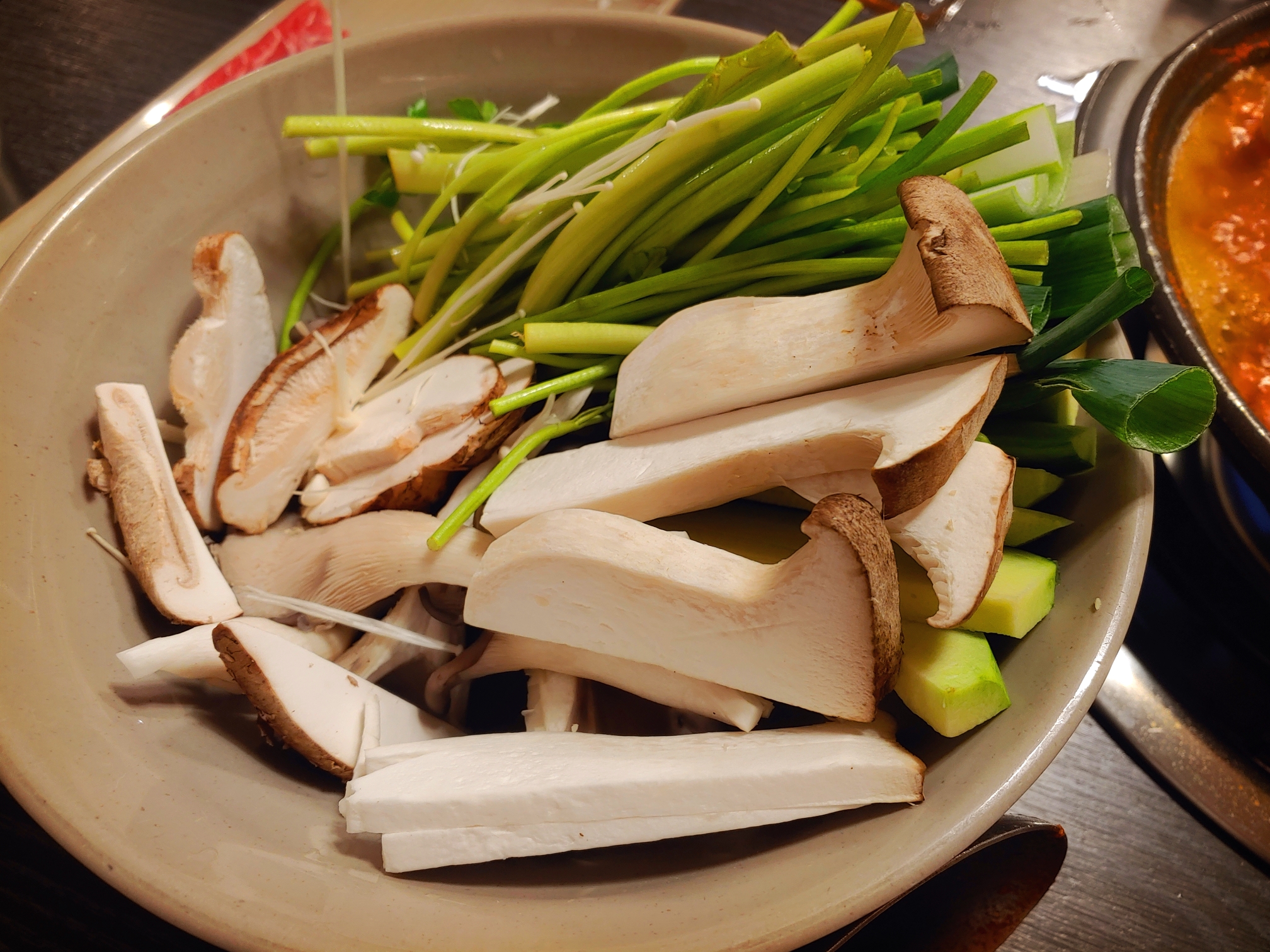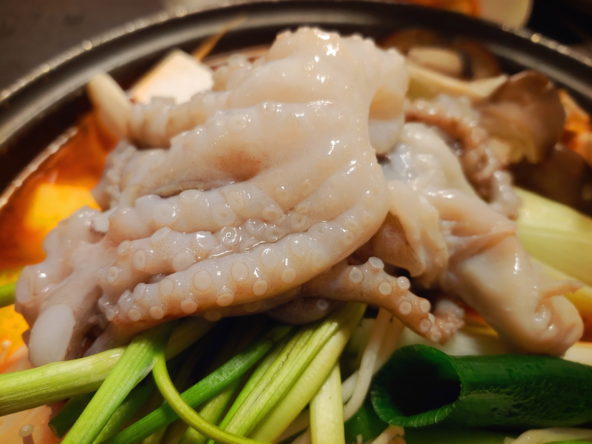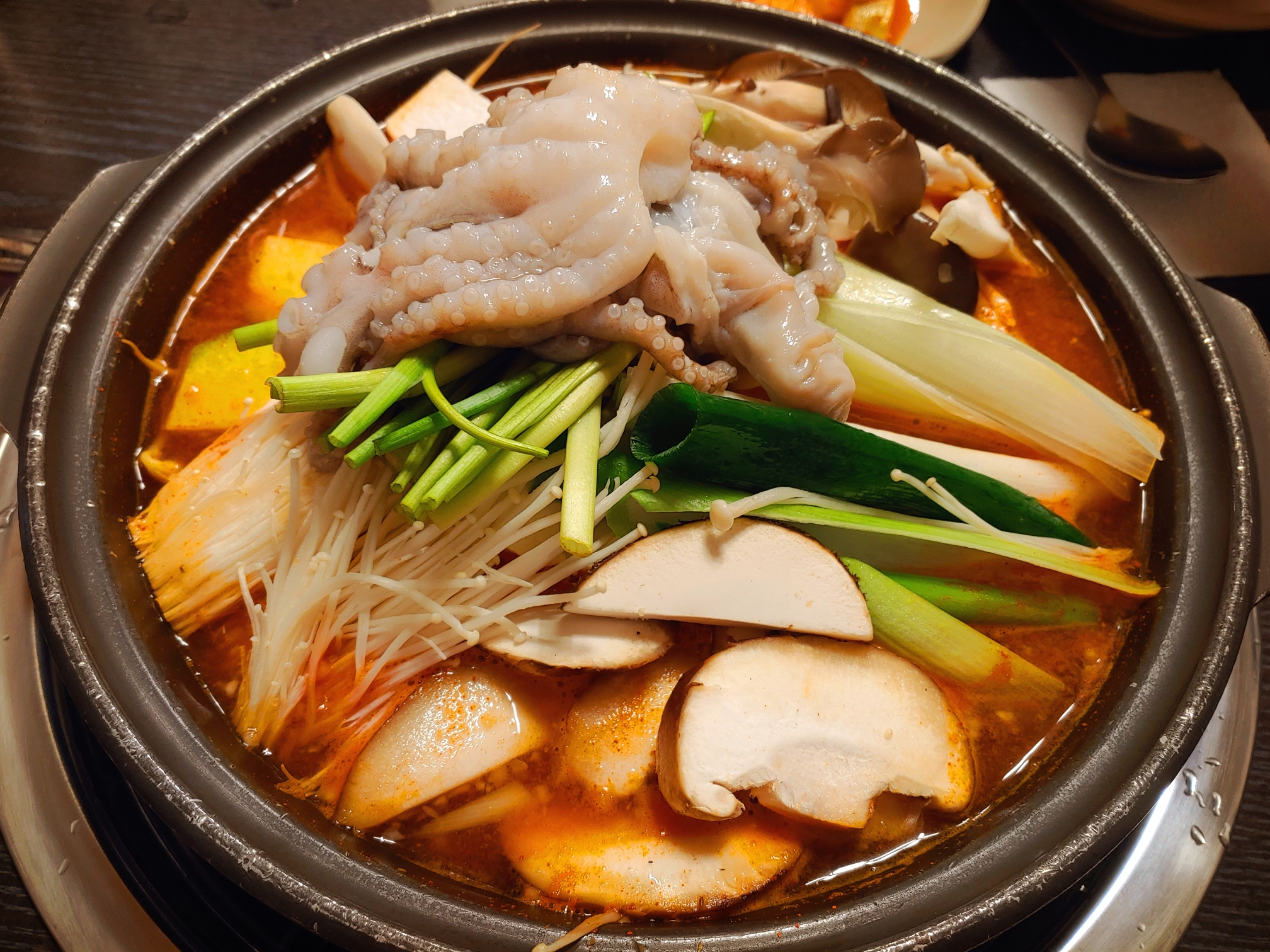 낙지와 각종 버섯, 두부, 대파, 미나리, 애호박 등이 푸짐히 올라가있다